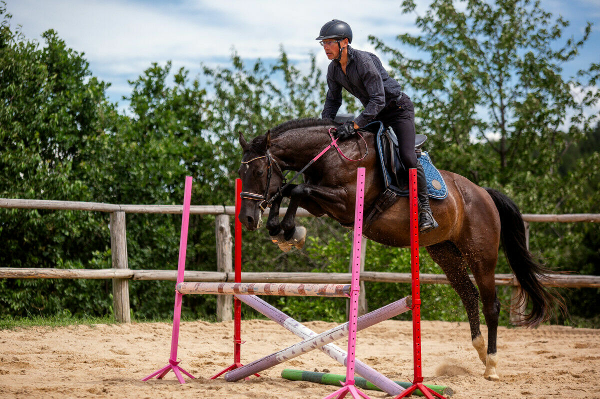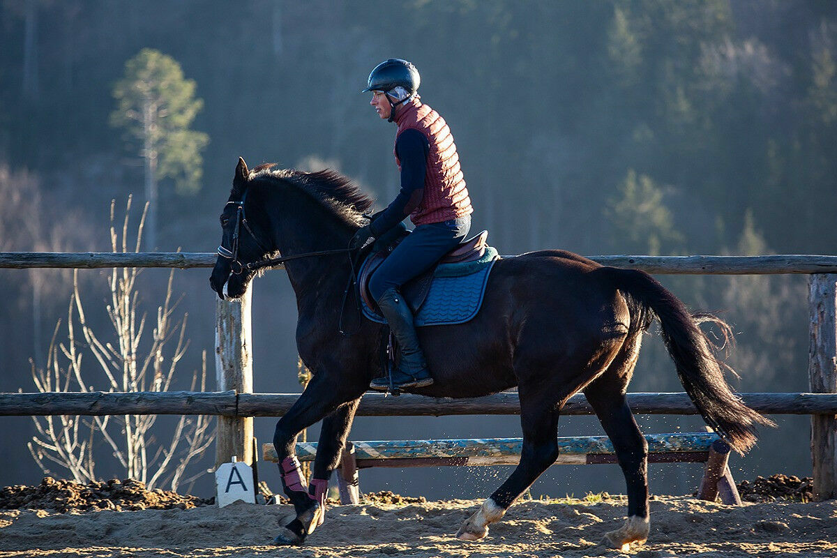 Koń nie spracowany treningami, pracujący 1-2 razy w tyg, chodzi w teren, na lonży pojedynczej i podwójnej, skacze (co wyraźnie lubi), zwrotna, chętnie robi pracę ujeżdżeniową. Zajeżdżona 2 lata temu, nie za dużo pracuje, ostatnie pół roku nic nie robiła (brak przestrzeni czasowej, oraz czekała w innej stajni w zapasie na et – nie jest źrebna)