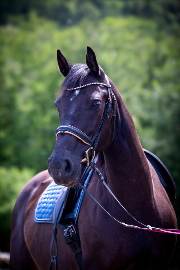 Klacz Baklava, karaWychowana u nas na rozległych pastwiskach w stadzie, zna i umie być w boksie, zadbana różnorodnym żywieniem, probiotyki, witaminy, stomatologicznie od 2 r.ż., wyrwane wilczaki (pełna dokumentacja). Wychów pastwiskowy na pagórkach w stadzie, oraz powolne wdrażanie konia do treningu dają najlepsza profilaktykę przeciw kontuzjom. Najlepszy wiek konia, który jest już przygotowany do intensywniejszych treningów i możliwie najlepiej zabezpieczony przez przypadkowymi kontuzjami. Kon w którego zainwestujesz tylko czas, nie wymaga leczenia, robienia zębów, kopyt itd. nigdy nie kuta.